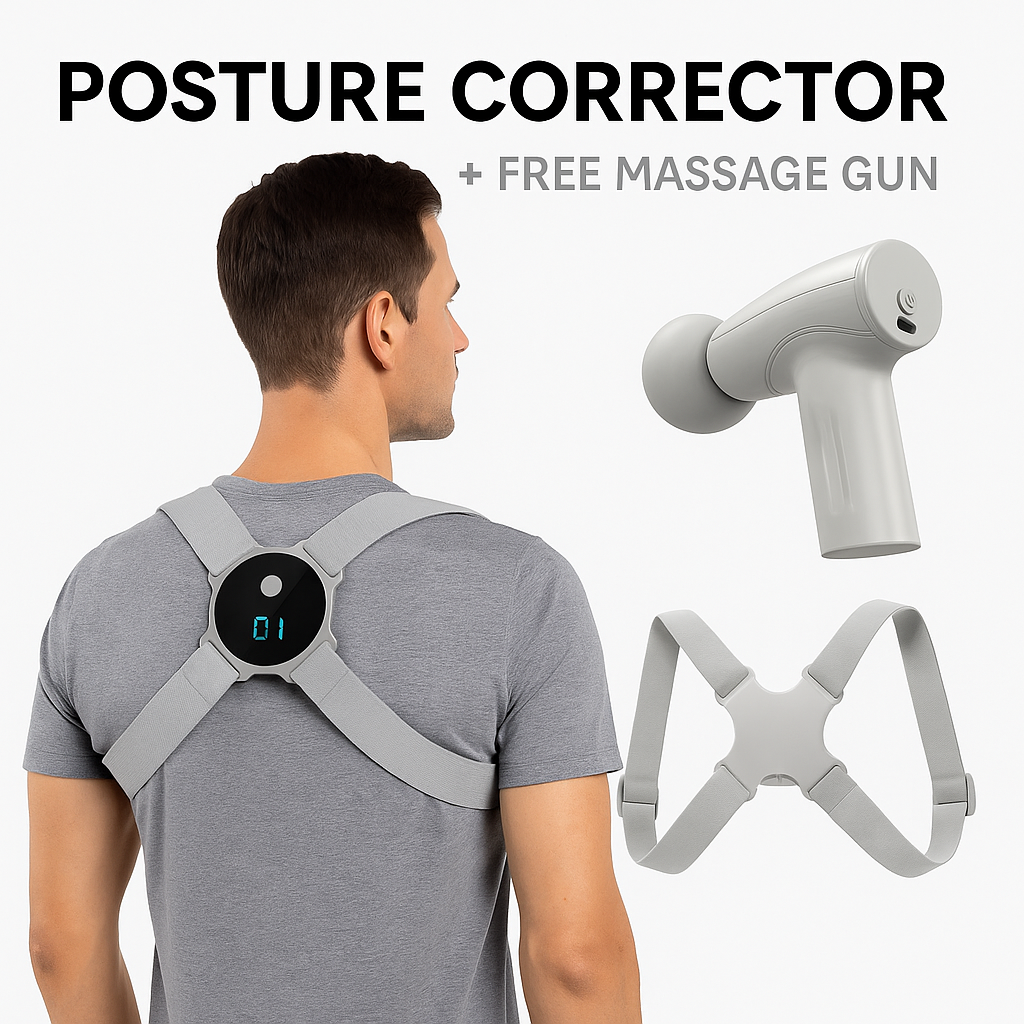 This is asmartposture trainer—it provides real-time feedback with a built-in LED screen and vibration alerts. And unlike most posture correctors, ours comes with aFREE massage gunto support muscle recovery too.